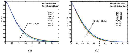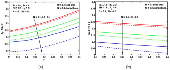 The nature of velocity and temperature curves for magnifying the buoyance ratio Nr and thermophoretic Nt is pointed out in Figure 2b and Figure 3a. It is manifested that velocity diminishes with the augmentation of Nr and Nt, and this phenomenon yields an increase in temperature curves ability that boosts the thermal boundary. This is due to the reality that greater values of Nr boost the temperature fluid. Figure 4a,b uncovers the impacts of Nr and Nt on skin friction coefficient Cf(τ,0) and the local Nusselt number Nu(τ,0) with several values of β. It is observed that both of Cf(τ,0) and Nu(τ,0) diminish sufficiently for physical parameters Nr and Nt. This because the thermophoresis strength triggers the nanoparticles to transmit the warm sheet to cold sheet which creates the thermal related boundary layer thickness to magnify. In addition, an enlarge in β corresponds to an enhancement in the Cf(τ,0) and salient reduction in Nu(τ,0). This is because a weaker Deborah number, β, gives a viscous impact compared to the elastic impact, whilst a greater β exhibits in the elastically solid material in nature which leads to a reduction in Nusselt number.