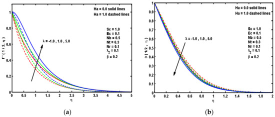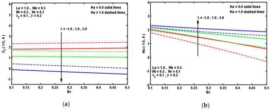 The nature of velocity and temperature curves against mixed convection parameter λ and Hartmann number Ha are sketched in Figure 5a,b. From these curves, it is concluded that intensifying λ improving the flow velocity and decaying the temperature curves. Because when growing λ, the impact of gravity is decreased, and then velocity within a boundary layer decreases. In addition, it is shown that the sway of magnetic strength reduces the fluid movement. This is realistic because magnetic strength is responsible to inspire Lorentz intensity which resists the fluid motion. Figure 6a,b determines the Cf(τ,0) and Nu(τ,0) against the λ and Ha with several values of Ec. It is noticed that Nu(τ,0) enhances but Cf(τ,0) reduces for the improved values of Ha, while an opposite reaction is found with λ. The reason, as mentioned above, is that Ha has a tendency to magnify the Lorentz intensity. This intensity resists the fluid movement and provides heat ability in the flowing. Furthermore, it is clear that an elevation in Ec results in an enhancement in the internal source of energy which boosts the thermal boundary layer, which results in a reduction in the Nusselt number for greater Ec.