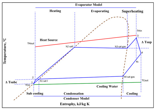 A T-s chart of the thermodynamic cycle is presented in Figure 3, which demonstrates the fundamental process and heat transfer of the ORC system. Thermodynamic analysis based on experimental parameter data became the main way to find out the binary cycle performance which has been constructed. The thermodynamic analysis consisted of mass conservation, energy conservation, and the second law of thermodynamics. All the analysis would be applied to binary cycle components, which consisted of a piston pump, evaporator PHE, scroll-type expander, and condenser PHE.