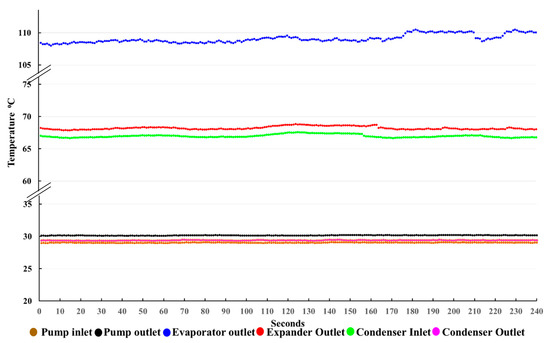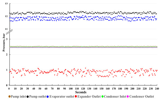 The variation of pressure in Figure 5 illustrates the data of four main components which operate in the experiment as a unified whole system. The pressure at the expander outlet, condenser inlet, and condenser outlet revealed a constant reading over the span of the experiment period. The opposite condition was observed at the point of the pump inlet, pump outlet, and evaporator outlet, where at that point, the data have fluctuated greatly. The pump inlet recorded data from 2.49 to 2.54 bar, while the pump outlet and evaporator outlet have shown values of 12.13 to 12.38 bar and 11.60 to 12.03 bar, respectively.