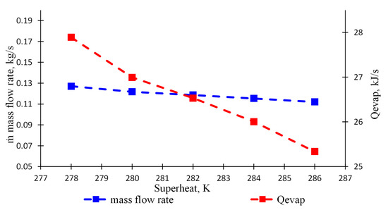- The lowest superheated vapour of 278 K required the highest mass flow rate of 0.127 kg/s and vice versa, the highest superheated vapour of 286 K required the lowest mass flow rate of 0.112 kg/s. This was because in the lowest superheated vapour, the flow of working fluid must be accelerated in order to gain the expected evaporator heat transfer rate and vice versa.