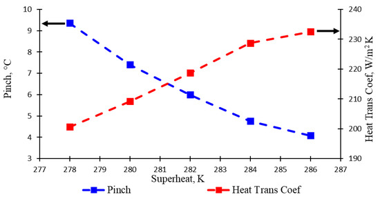 The lowest temperature difference between the two composite curves is known as the pinch point, such as in a heat exchanger. The size of the pinch point expresses high thermal losses caused by external irreversibility. The waste work potential or the lost opportunity to do work in thermodynamic analysis can be called irreversibility. Figure 7 demonstrates the changes in pinch points and evaporator heat transfer coefficients for a variety increases in superheated vapour degree. The line indicated with blue colour shows the pinch point, which declined gradually during the span of the experiment. This condition was clearly acceptable due to the superheated vapour and pinch points being always in opposite positions. Therefore, when the superheated vapour temperature was small or equal to 278 K, the temperature of the pinch point was the largest or equal to 9.35 °C, and vice versa; when the superheated vapour temperature was greater or equal to 286 K, the pinch point temperature would be smaller or 4.08 °C. Moreover, if the superheated vapour temperature increased, it would result in smaller irreversibility because the pinch point became smaller.