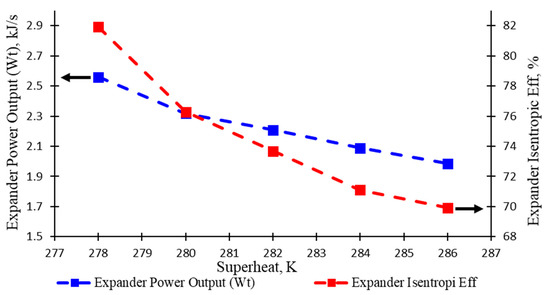 Figure 8 illustrates the effect of variation in the degree of superheated vapour on expander behaviour. As observed, the expander power output, which is indicated by the blue colour, slumped gradually with the range 1.98 to 2.56 kW over the span of the experiment. Similarly, expander isentropic efficiency, which is indicated by the red colour, yields a sharp decreased trend with the range from 69.93% to 81.91% in the retrieval of data during the experiment. Increasing the superheated vapour degree is usually done by adding a heat input in the evaporator; therefore, both the network and heat input increase as a result of superheating the vapour to a higher temperature, as revealed in the thermodynamic fundamental. On the other hand, as seen in Figure 8, there is a sufficient decrease caused by a shrink in mass flow rate. The experiment with determined superheated vapour values of 278, 280, 282, 284, and 286 K, has resulted expander power outputs of 2.56, 2.32, 2.21, 2.10, and 1.98 kW, respectively, and then, produced expander isentropic efficiencies of 81.91%, 76.27%, 73.68%, 71.09%, and 69.93%, respectively.
