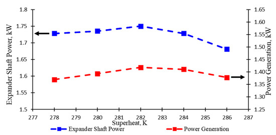 The graph in Figure 9 presents a variation in temperature of the superheated vapour that affected expander shaft power (indicated in blue) and power generation (indicated in red). Both display a uniform trend, which nearly remained unchanged from the superheated vapour 278 K until 282 K. At this point, both started to show a small decline in superheated vapour at 284 K and continued to deeply drop until the last experiment. As observed, the increase in superheated vapour has no effect on the expander shaft power, especially during the range temperature of superheated vapour from 278 to 282 K. However, with the further derivation in mass flow rate (as revealed in Figure 6), the expander work output decreased deeper (as revealed in Figure 8) and showed an effect of expander shaft power for going down during the range temperature of superheated vapour from 284 to 286 K. When comparing expander work output in Figure 8 and expander shaft power in Figure 9, they should have the same trend, but the results of the experiment are relatively different. This is possibly influenced by the machinery mechanism and using generator equipment. The experiment with determined superheated vapour values of 278, 280, 282, 284, and 286 K has resulted in expander shaft power of 1.729, 1.736, 1.75, 1.73, and 1.168 kW, respectively, and then, produced power generation of 1.37, 1.39, 1.42, 1.41, and 1.37 kW, respectively.