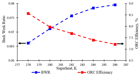 The illustration in Figure 10 informs the difference in degree of the superheated vapour, which affects system overall performance, namely back work ratio (BWR) and ORC efficiency. Both are, indeed, ways to reveal whether the system as a whole has the best performance. Consequently, BWR at a lower value is better than a high value, whereas ORC efficiency is vice versa. BWR (indicated in blue) and ORC efficiency (indicated in red) have a uniform tendency in the opposite direction. Starting with the exact value of 0.066, BWR constantly increased with a small degree of curve during the span of the experiment. Absolutely, ORC efficiency decreased with slope curve over the interval in degree of the superheated vapour. The experiment with determined superheated vapour values of 278, 280, 282, 284, and 286 K has resulted back work ratios of 0.066, 0.071, 0.075, 0.078, and 0.079, respectively, and then, produced ORC efficiencies of 8.6%, 8.0%, 7.7%, 7.4%, and 7.2%, respectively.