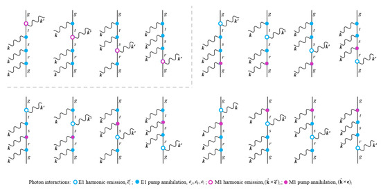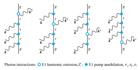 In the above expressions, the microscopic nonlinear susceptibility (or hyperpolarizability) is formulated in terms of electric dipole (E1) interaction with each optical field—indeed by far the major part of nonlinear optics is based on this often implicit assumption. This accords with the simple appearance of the electric field operator for each of the four photons involved in each distinct frequency conversion interaction, which it will be convenient to represent as E1