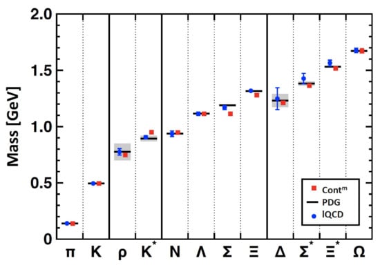Masses of pseudoscalar and vector mesons, and ground-state positive-parity octet and decuplet baryons calculated using continuum (Cont—squares, red) [] and lattice (lQCD—circles, blue) [] methods in QCD compared with experiment [] (PDG—black bars, with decay-widths of unstable states shaded in grey). The continuum study did not include isospin symmetry breaking effects, which are evidently small, as highlighted by the empirically determined - mass difference (<7%).