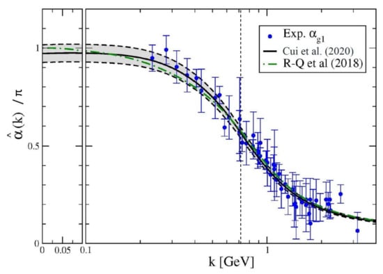 Solid black curve within grey band—RGI PI running-coupling, , computed in [] (Cui et al. 2020), and dot-dashed green curve—earlier result (R-Q et al. 2018) []. (The grey band bordered by dashed curves indicates the uncertainty in the result arising from that in both continuum and lattice-QCD inputs and is detailed in [].) For comparison, world data on the process-dependent charge, , defined via the Bjorken sum rule, are also depicted. (The data sources are listed elsewhere []. For additional details, see e.g., in [,,].) The k-axis scale is linear to the left of the vertical partition, and logarithmic otherwise. The vertical line, , marks the gauge sector screening mass, Equation (12).