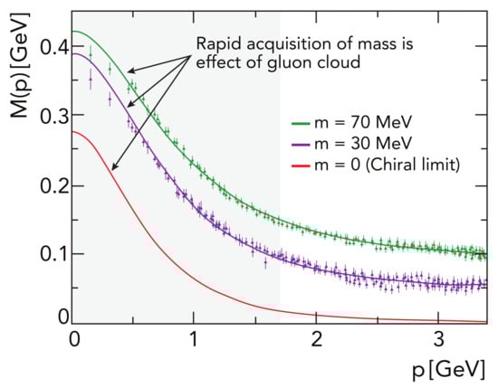 Renormalisation-group-invariant dressed-quark mass function, in Equation (13): solid curves—gap equation solutions [,], “data”—numerical simulations of lQCD [], available for current-quark masses MeV. QCD’s current-quark evolves into a constituent-quark as its momentum becomes smaller. The constituent-quark mass arises from a cloud of low-momentum gluons attaching themselves to the current-quark. This is DCSB, the essentially non-perturbative effect that generates a quark mass from nothing; namely, it occurs even in the chiral limit. Notably, the size of is a measure of the magnitude of the QCD scale anomaly in -point Schwinger functions []. Moreover, experiments on GeV at the modern Thomas Jefferson National Accelerator Facility (JLab) will be sensitive to the momentum dependence of within a domain that is here indicated approximately by the shaded region.