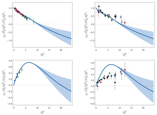 - Punjabi, V.; Perdrisat, C.F.; Aniol, K.A.; Baker, F.T.; Berthot, J.; Bertin, P.Y.; Bertozzi, W.; Besson, A.; Bimbot, L.; Boeglin, W.U.; et al. Proton elastic form factor ratios to Q2=3.5GeV2 by polarization transfer. Phys. Rev. C 2005, 71, 055202. [Google Scholar] [CrossRef]
