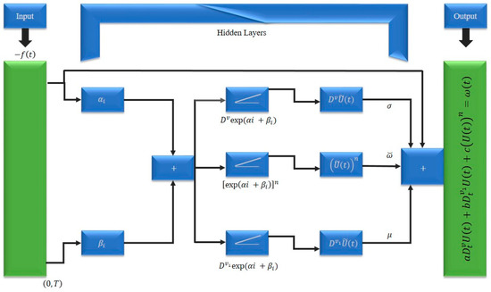 In the above expressions (51)–(53), the nonlinear operator and unknown function are represented as and The constant is span input in the interval The constant coefficients are indicted as while are contents. The BT-equation also appear in the neural networking specifically in feed-forward artificial neural network (FFA-NN) and its graphical sketch is presented in the Figure 1. In addition, it is important to highlight that the said problem arises in fractional calculus as a fractional differential equation in neural networks (FDE-NNs). Readers are referred to see [41] for more details about said physical fractional problem of complex nature. It is noted that mathematical formulation of aforementioned problem is the linear combination of the discussed networks while the solution of unknown function could be appropriate unknown weights. In account of this presented model the numerical experiments have been performed when digits = 100, and the orders of derivatives are taken as: