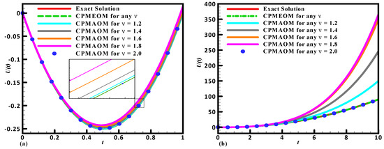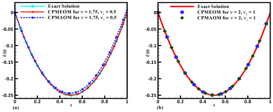 The proposed methodology in the previous section is adopted to examine the problem understudy and graphical illustration is with the help of set of graphs while a tabular form (see Table 1, Table 2 and Table 3) of comparison is presented with exact solution and previous literature [39,40]. It is noted that the CPM via brings more accurate and efficient results as compared to CPM via which is clear from the graphical plots. The Figure 3a is plotted for and One can observe that the CPM via is in excellent agreement with the exact solution while the CPM via converges to the exact solution as the value of increases. The Figure 3b is plotted for integer values of derivatives and CPM by means of both kinds of OMs found in good agreement with exact solution which can also be noted form the last two columns of Table 2. The Table 1 and Table 3 are constructed for various values of fractional derivatives to show a comparative analysis between CPM via both kinds of OMs. The Figure 4a is illustrated for the same purpose wherein we can observe that CPM via is more efficient as compared to CPM via It is witnessed from the Figure 4b that method using exact operational matrices still provides an exact solution for higher domain. It is important to highlight that the methods are depending on the developed operational matrices of derivatives. If we use the new operational matrix of derivative i.e., , the accuracy of the method is improved at tangible level for any arbitrary values of fractional derivatives. On the other hand, the method depending on contains errors which could be minimized by taking higher values of