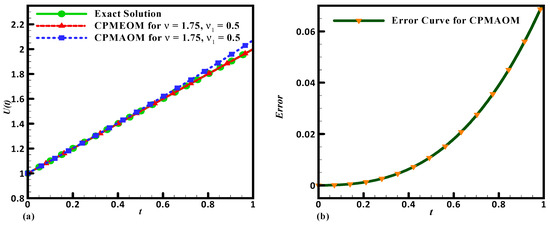 The proposed scheme is adopted to examine the solution of physical problem understudy and noted that an exact solution is obtained using CPMEOM method for a very small value of N while the CPMAOM contains some error, which is asserted by means of graph (see Figure 6a) and tabular form of the comparative study is given in the Table 7. The graphical illustration of error analysis is presented in Figure 6b. The accuracy level of proposed technique is examined by calculating the L2, L∞ and root mean square (RMS) errors while their descriptions are given below.