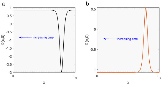 This system describes shallow water waves, where indicates the velocity of wave, presents the height of free wave surface, and x and t play the role of the spatial and the temporal derivatives. The constants and are non-zero. The dynamics of shallow water waves are described by the Korteweg-de Vries (KdV) equation. However, the Boussinesq equation perfectly governs shallow water waves and gives much better approximation to such waves [28]. The exact solutions of system (1) have been derived by various scientists. For instance, the authors in [29] presented some traveling wave solutions for system (1) using the -expansion method. Huiqun [26] applied the extended Jacobi elliptic function expansion process to construct some periodic solutions for system (1). The improved ()-expansion technique was used in [27] to extract the exact traveling wave solutions of system (1). Zheng [30] applied the generalized Bernoulli sub-ODE method to extract traveling wave solutions for system (1). Patel et al. [31] utilized nonlinear Boussinesq equations to model the shallow water waves. Then, the Adams–Bashfourth (AB) predictor–corrector approach was used to derive the numerical solution of a nonlinear Boussinesq equation.