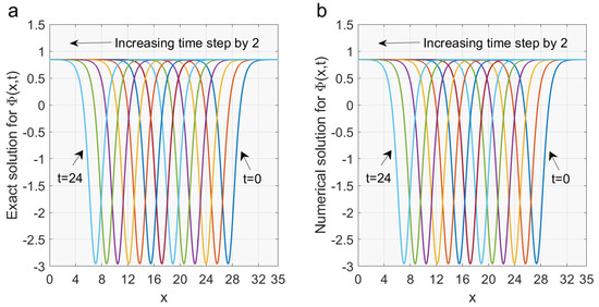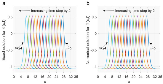 Figure (a) shows the time evolution of the exact solution of while Figure (b) presents the time evolution of the numerical solution of We consider