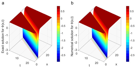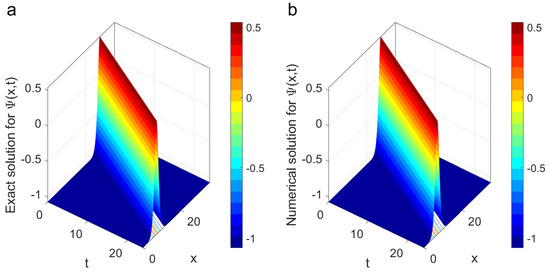 3D figures comparing the performance of the numerical method with the exact solution. The exact solution of (Figure (a)) and the numerical solution of (Figure (b)) are graphically compared in these plots.