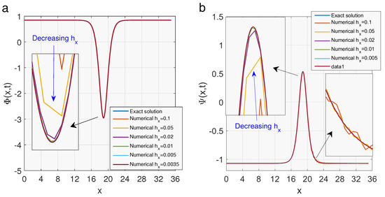 The initial condition is derived from Equation (24) by taking as shown in Figure 1. In Figure 2, we present the time evolution of the exact and numerical solutions of for Moreover, Figure 3 illustrates the time evolution of the exact and numerical solution of for In order to evaluate and at and we use some fictitious points given by