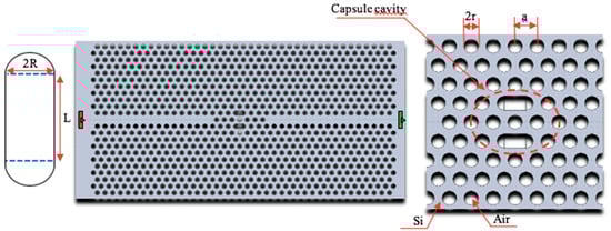 Due to the constant advancement of sensing applications, optical sensors have gained remarkable attention and popularity as promising sensors because of their exclusive characteristics, such as immunity to electromagnetic interference, quick and fast response, high speed and remote sensing capability. The relentless demand for optical sensors has prompted researchers worldwide to look beyond optical sensors in the domain of pharmaceutical and food quality management and towards the field of sensing and the healthcare sensing domain, as in [1,2,3]. A recent approach garnering remarkable attention is photonic crystal (PhC)-based sensors, whereby cylindrical air holes with a given lattice constant in a thin silicon membrane are capable of engineering the light emitted and bringing it to exactly where it is required to get the measurement difference and variant refractive index (RI) configuration by manipulating the air hole diameters and pitches (distance between air holes) to guide the light. The key to PhC technology is in the magnitude of the arrangement of the air holes, whereby an array of air holes encompass a silica core section. This reduces the average refractive index of that core part. Moreover, light is restricted to the core without the use of dopants. In the fabrication process, three modules are gathered to develop a jacketing tube, a silica core rod, and preformed silica capillaries. The capillaries in the rod are bundled and injected into the jacketing tube. By drawing and heating the assembly, the capillaries in the rod fuse to form a photonic crystal fiber. Therefore, various procedures and formations are persistently being proposed to optimize and upsurge the microcavity detection efficiency [1,2,3,4,5], ring resonators [6] waveguides [7,8], slot waveguides [9] and heterostructures [10]. All the aforementioned studies have exploited extreme sensitivity-resonant conditions in PhC concerning the refractive index changes. Thus, this paper addresses the sensitivity and the transmission limit in proportional relation, unlike previous studies that reported decent quality factor values at the expense of transmission. Safia et al., in [11], reported a sensitivity of 462 nm/RI unit (RIU), and a high quality factor of 1.11 × 105; however, the transmission was less than 80%. Lijun Huang et al., in [12], proposed a design based on the ring–slot resonator, the quality factor achieved is 11,477.3 and achieving a sensitivity of 160 nm/RIU; however, the transmission rate was 80% as well. Another technique is based on surface plasmon polaritons (SPPs) exploited for the design of plasmonic RI sensors with high sensitivity [13,14]. In PhC design, high quality factor values must be accompanied by an increase in transmission rate in order to manufacture imperfections. Thus, the inverse relationship between quality factor and transmission parameter greatly limits the potential for practical applications [15]. This paper proposes a new sensor with a capsule-shaped cavity coupled to an input waveguide to excite the cavity resonance, and an output waveguide to measure the transmission spectrum through the capsule-shaped cavity. In addition, the ability of the presented cavity to achieve a higher sensitivity, a high quality factor and a low detection limit (DL) are considered to reflect an increase in the transmission rate, which is important for practical applications. The proposed design is not considered complicated in its form or shape. In fact, it is easy to fabricate with less manufacturing imperfections.