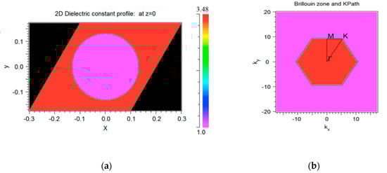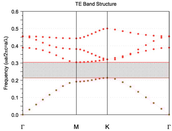 Figure 2b demonstrates the Brillouin zone (BZ) and k-path for a 2D triangular lattice as well, where k represents the wave vector in the BZ. This structure exhibits a wide transverse electric (“TE”) bandgap in the diagram dispersion in the normalized frequency between 0.2137 (ωa/2πc) and 0.3044 (ωa/2πc), as presented in Figure 3.