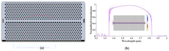 (a) The design of the photonic crystal waveguide; (b) the transmission spectrum of the photonic crystal waveguide W1 (the energy concentrates in the line defect).