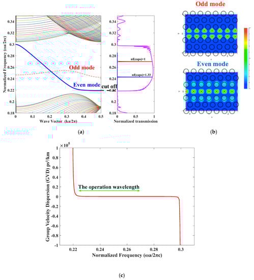 The modes inside the photonic bandgap (PBG) are separated by the lateral symmetry of the magnetic field to even and odd modes, as shown in Figure 5b, where the even and odd forms are represented by red and blue solid curves, respectively.