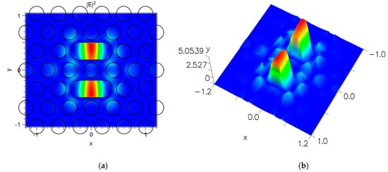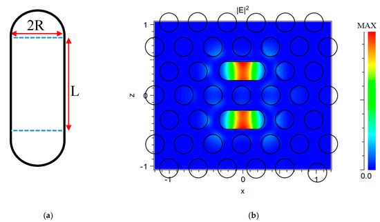 The cavity is created to take a capsule shape in the middle of both sides of the device. This coupled with two waveguides formed by presenting line defects with a capsule length L = a and a radius R = r as the initial sizes of the cavity shown in Figure 6a. The confinement in the horizontal plane of the PBG is obtained, as illustrated in Figure 6b. At the resonance, wavelength light cannot penetrate the periodic structure and the energy of the electric field intensity distribution is concentrated in the center of the cavity. This reduces the loss in the structure and enhances the light–matter interaction.