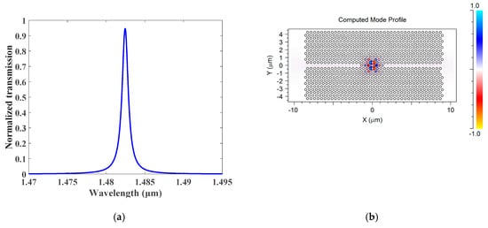 The resonant channel impulse cavity’s response without liquid analyte infiltrated is shown in Figure 7a. When the photonic crystal cavity is in the resonance state, a piercing peak with a Lorentzian line structure arises in the photonic crystal bandgap in the TE polarization. The capsule-shaped cavity exhibits a resonant mode at a wavelength of 1482.22 nm. Figure 7b shows the Gaussian wave through the cavity in the horizontal plane. It is obvious that the field intensity is intensely restricted in the sensing region of the cavity. The Q factor of the resonance frequency is expressed as the center wavelength λc divided by the Full Width at Half Maximum (FWHM) Q = λc/Δλ of the peak. The component of quality obtained from the resonance wavelength is 1482 = 1568.73.