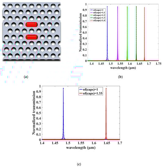 (a) Diagrammatic representation of the photonic crystal (PhC) sensor structure based on cavity with a capsule shape; the red capsule denotes the sensing region filled with analyte liquid, with n = 1.33; (b) determination of the sensitivity using five different refractive indices. (c) The resonant wavelength shifts, equal to 165.05 nm, due to the refractive index (RI) change from nf(caps) = 1 to nf(caps) = 1.33.