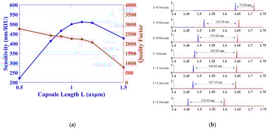 We investigated the effect of the capsule length L on the sensitivity and quality factor; as shown in Figure 9a, the length L changes from L = 0.5 × a nm to L = 1.5 × a nm. As the length L increases, the sensitivity S increases, which reflects the proportional relation. In contrast, the quality factor decreases as the length increases, which indicates an inverse relation. Figure 9b illustrates the shift in the resonance wavelengths corresponding to L variable values; the largest shift, = 168.81 nm, corresponds to L = 1.1 × a.