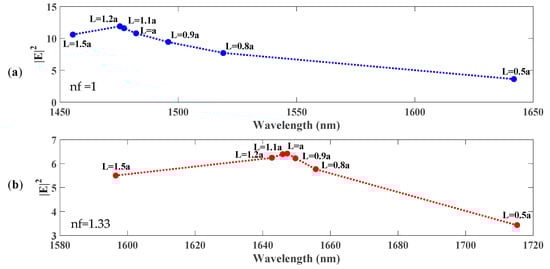 Figure 11a,b represent the energy of the electric field distribution with different capsule lengths, with and without the analyte liquid (nf = 1, nf = 1.33), as the length of the capsule L = 0.5a. A large intensity near the boundaries of the capsule cavity can be observed, which indicates low confinement and that the mode is either not localized or not concentrated on the sample. The perfect confinement, localization, and concentration come with the length L = 1.1a where the electric field’s intensity at the boundaries of the capsule cavity is very small; therefore, the light–matter interaction can be improved. As the length increased to L = 1.5a, the confinement became weak and the interaction with the adjacent holes became larger.
