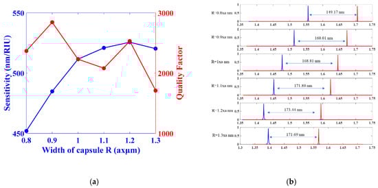 As the length is chosen to be L = 1.1 × a nm, the effect of capsule radius R is studied from R = 0.8 × r nm to R = 1.3 × r nm. As shown in Figure 12a, R = 1.2 × a nm led to a high sensitivity S = 525.59 nm/RIU, a high quality factor Q = 2531.18, and a low detection limit DL = 1.21 × 10−4 RIU. The highest sensitivity corresponds to a high shift of 173.44 nm, as shown in Figure 12b.