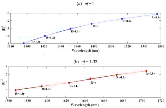 Figure 13a,b illustrate that the change in the capsule width affects the energy and the resonant modes inside the cavity. It is noticed that the capsule width R increases when the cavity refractive index is nf = 1. Hence, the resonant mode strides to higher frequencies and the energy thereby decreases. Once the cavity is infiltrated with analyte liquid nf = 1.33 and the capsule width R increases from R = 0.8r to R = 1.3r, the resonant mode shifts to higher frequencies, but with smaller values than the resonant modes without infiltration, which provides a higher sensitivity once R = 1.2r, as shown in Table 2.