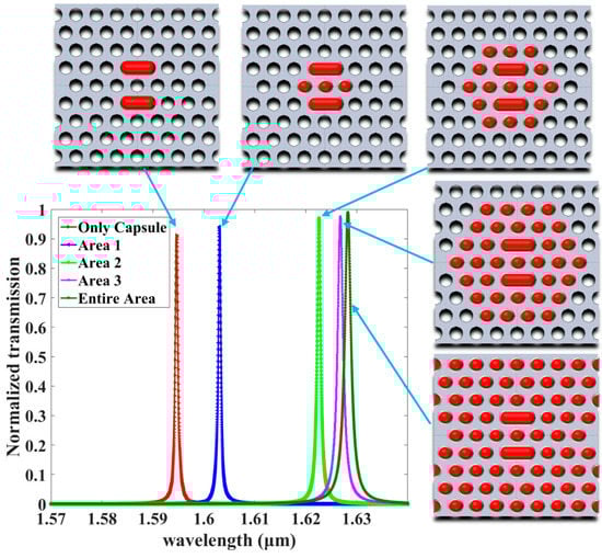 As mentioned, the resonance modes depend on the defect size of the microcavity. Selected parameters were considered, including an optimized size with a capsule length L = 1.1 × a nm and width R = 1.2 × r nm, which provide a high sensitivity S = 525.59 nm/RIU, a high quality factor Q = 2531.18 and a low detection limit DL = 1.21 × 10−4 RIU. Moreover, due to the significant effects of the holes around the cavity on the mode in the cavity, the sensing areas were divided into five areas, as shown in Figure 14.