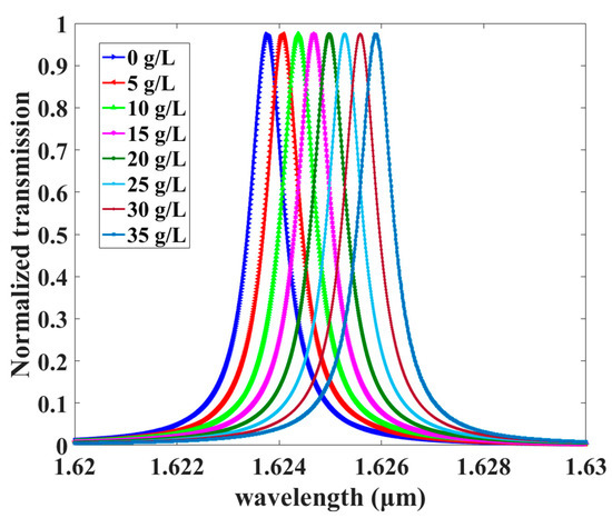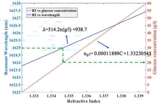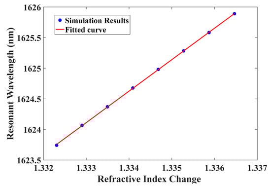where C represents the concentration of glucose (g/L) and ng/L is the RI. As presented in Figure 16, the transmission spectra of the resonant wavelength shift with a nearly constant distance due to the variation in the RI from 1.33230545 to 1.3364666 by the infiltrated liquid. Thus, the sensitivity S is almost constant until the resonant frequency varies within a trivial scale. The wavelength 1623.74 nm was determined as the reference mode and complies with the minimum value of glucose concentration, as can be seen in Figure 17. It is observed that, by increasing the concentration of glucose, the resonant wavelength mode shift increases in a roughly linear way (blue dots). Curve fitting was used to obtain the mathematical function that examines the correlation between the RI corresponding to the glucose concentration and the wavelength shift (red curve), which is expressed as follows: