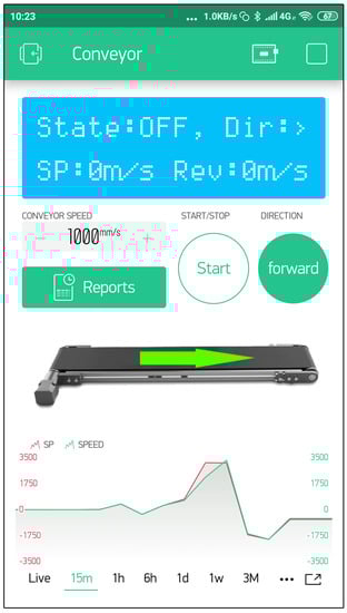 The smartphone application for machine monitoring and control for the experimental setup was developed in BlynkApp. The user interface of the developed application is shown in Figure 3. It includes an LCD display (connected to the virtual pin V0) that displays important information about the state of the conveyor (running or stopped), as well as the direction and current speed of the conveyor belt. The desired SPV (virtual pin V3) of the conveyor can be set either through direct input of the new desired set point or by the + and − buttons, which increase or decrease the speed by a predefined value (e.g., by 100 mm/s; this predefined value can be changed in the control properties). Similarly to manual control (Figure 2b), there is a Start/Stop button for starting and stopping the machine (virtual pin V1) and a Direction button for setting the direction of the motor’s rotation (virtual pin V2). There is also a visualization of the current state of the conveyor on an image with a displayed arrow indicating the moving direction of the conveyor belt. Finally, there is a plot on the bottom part of the user interface that displays two trend lines: the trend line of the desired SPV (virtual pin V4) and the trend line of the real current conveyor speed (virtual pin V5). The plot can display live data, meaning that it will immediately display any change on the virtual pins, or it can be set to display past changes in a chosen time interval, which can range from 15 min to 12 months.
