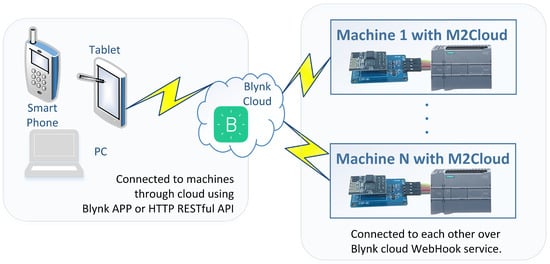 In addition to the smartphone application, the data in the cloud can be accessed through the Blynk HTTP RESTful API [30] commands, which allows any device or software having the required token to access the data in the cloud, or interconnect the data from multiple M2Cloud modules connected to diverse machines or systems through the cloud service WebHook [29]. Figure 4 illustrates the possibility of data exchange between multiple machines (systems) and users.