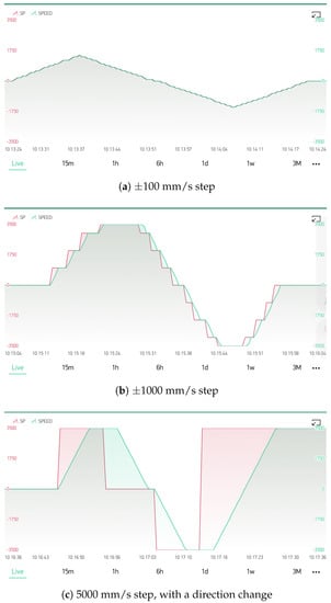 In the second step of the experimental validation, the VDF was turned on, and the system operation was tested again. First, different functions (start and stop of the conveyor belt, speed change and direction change) were tested when initiated from the hardware user interface, while the changes were monitored on the smartphone application along with the direct first-person overview of the machine. Next, the same functions were tested again, this time initiated from the smartphone application. The SPV was first changed with a step of ±100 mm/s in the ±1500 mm/s range (Figure 5a), then with a step of ±1000 mm/s in the ±3500 mm/s range (Figure 5b), and in the end, with step changes from 0 to 3500 mm/s, from 0 to −3500 mm/s, and from 3500 to −3500 mm/s (Figure 5c). This validation step confirmed that the system upgraded with the extension through the M2Cloud module still operated as expected and that the additional communication load between the PLC and the M2Cloud module did not disrupt the normal operation of the machine.