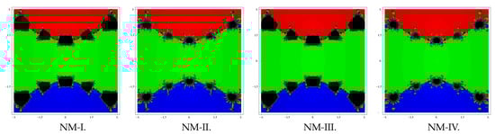 As the first example, consider the polynomial which has zeros each with multiplicity 3. For drawing basins, we use a rectangle R of size and fix the color green to each initial point in the basin of zero “”, the color red to each point in the basin of zero “”, and the color blue to every point in the basin of zero “”. Basins so drawn for the methods NM-I–NM-IV are shown in Figure 1. It is clear that the methods NM-IV and NM-II posses fewer divergent points (painted with black color), followed by NM-I and NM-III.