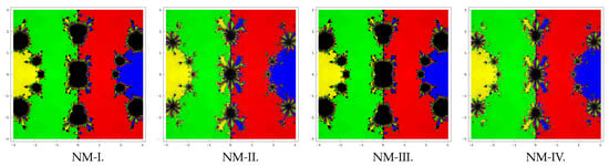 Consider the polynomial that has four zeros with multiplicity two. In this case also, we use a rectangle of size and paint the basins with blue, yellow, red, and green colors of the zeros 2, , , and , respectively. From the graphics displayed in Figure 2, we conclude that the methods NM-II and NM-IV have better convergence than NM-I and NM-III.