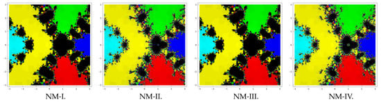 Lastly, consider the polynomial that has five zeros each with multiplicity two. We use a rectangle of size and assign the red, blue, green, cyan, and yellow colors to the basins of attraction of these five zeros. Basins so assessed by the methods are shown in Figure 3. Like previous examples, in this case also the methods NM-II and NM-IV possess better convergence than NM-I and NM-III.