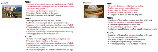 Image-to-text retrieval by our approach MTLS, MTFN [19] and VSE++ [44]. For each query image, we provide the top-5 ranked captions by MTLS, MTFN and VSE++ at the right-hand of the image, and the ground-truth ones are marked as red.