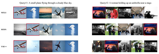 Text-to-image retrieval by our approach MTLS, MTFN [19] and VSE++ [44]. For each query text, we provide the top-5 ranked images from left to right retrieved by MTLS, MTFN and VSE++, and the ground-truth ones are outlined by red box.