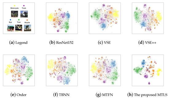 For a better understanding of local structure transferring, we visualize the image representations in the Vehicle dataset which are generated by ResNet152, VSE, VSE++, Order, TBNN, MTFN, and MTLS. The t-SNE visualization results are demonstrated in Figure 5, and the legend of visualization is in Figure 5a.