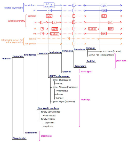 Cerebral sulci are highly lateralized in humans. Leftward sulcal asymmetry reported in the central sulcus (cs) is associated with handedness [21,22]. Additionally, leftward sulcal asymmetry in the paracingulate sulcus has been linked with cognition [23,24], while rightward sulcal asymmetry in the superior temporal sulcus (sts) is relevant to fMRI-defined right-lateralized voice selective responses [25,26]. Cortical lateralization, along with sulcal asymmetry, has been classically considered to be a unique characteristic in humans [27]. However, sulcal asymmetry has been observed in nonhuman primates such as great apes [28,29] and macaque monkeys [29]. This report summarizes the results of our studies and other findings regarding the laterality of sulcal infolding in the cerebral cortices of macaque monkeys—a genus of the Old World monkeys. The pattern of sulcal asymmetry in macaques to other primates was compared to speculate on the evolutionary significance of the sulcal asymmetry in primates. The sulcal asymmetry of the macaque brain and its related characteristics are summarized in Figure 1 in comparison to other primate species.