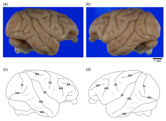 Eternal surface and sulcal map of the left and right cerebral cortex in cynomolgus macaques. (a) Photograph of the right hemisphere. (b) Photograph of the left hemisphere. (c) Sulcal map of the right hemisphere. (d) Sulcal map of the left hemisphere. ars, arcuate sulcus; cs, central sulcus; ios, inferior occipital sulcus; ips, intraparietal sulcus; lu, lunate sulcus; ots, occipitotemporal sulcus; ps, principal sulcus; sf, Sylvian fissure; sts, superior temporal sulcus.