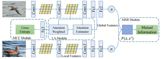 Figure 1 provides an overview of the proposed method, and the three different modules are marked with rectangles in the figure. We can see that our model has a symmetric structure, and it takes image pair which contains the same object as input and produces local features from the middle convolution layer as well as the global features from the first fully connected layer (Fc1). The top pipeline of the model shares the parameters with the bottom one, which means, there is only one backbone network in our model. In the MMI module, we make use of the global features of the image pair to compute the mutual information loss. The global features are converted to the semantic probability corresponding to each class in the second fully connected layer (Fc2) and the semantic probability is used to compute the mutual information of the input paired images. In the MMI module in Figure 1, z and represent the class assignment variables and represents the joint distribution which will be discussed in Section 3.2. Meanwhile, in the LA module, the global features are used to estimate the attention map of the local features and we utilize the estimated attention map to choose discriminative features from the local features. This is conducted by using the estimated attention to weight local features. Besides, in the MCE module, the chosen features are used to compute the cross-entropy loss and complete the category assignment.