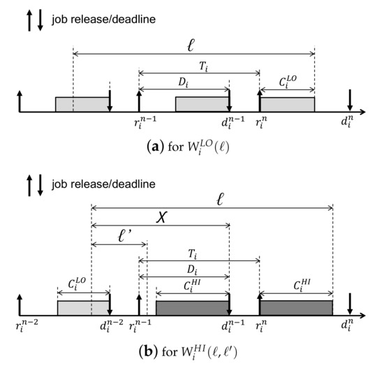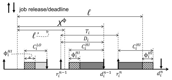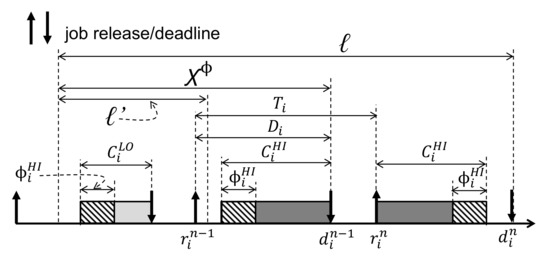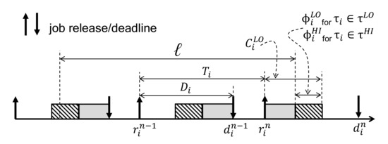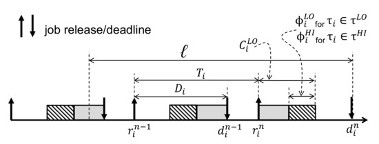 With regard to for , we need to consider that a mode transition can occur in [) because such a task can execute even after the mode transition. Let be the maximum workload of a task in an interval of length ℓ assuming that a mode transition occurs at the end of ; is assumed to start at the beginning of ℓ. Figure 1b presents the scenario where occurs. As shown in Figure 1b, the last job released after the mode transition starts its execution for at and finishes it at the end of the interval of length ℓ. When it comes to the middle job that a mode transition occurs in [), it executes for . The left-most job that a mode transition occurs after starts its execution as late as possible and finishes it at . Considering a job fully executing for (e.g., the rightmost and middle jobs in Figure 1b) and jobs executing the portion of , is calculated as follows: