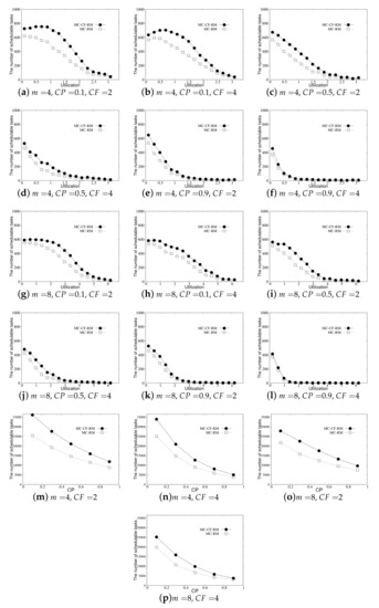 Figure 6 presents the evaluation results to compare the performance of MC-RM and MC-CF-RM in different evaluation settings. Figure 6a–l show the number of task sets over varying task set utilization with different values of m, , and . The performance gap between MC-CF-RM and MC-RM becomes larger for smaller and , and thus it becomes smaller for larger and as shown in Figure 6a,f. This is because the performance improvement resulting from the CF policy is determined by the value of and as Equation (9) and (15) indicate, but is derived in a rather pessimistic way as it considers every for . Such the inevitable drawback for deriving is from the characteristic of normal MC systems such that it is not clairvoyant with respect to the timing of a mode transition. Thus, task sets having smaller LO-criticality tasks can have a higher chance to be schedulable under MC-CF. As presented in Figure 6g,l, a similar trend is shown for with . In addition, a similar trend is observed in Figure 6m–p; while Figure 6a–l show the number of schedulable task sets for a varying value of U with a fixed value of , Figure 6m–p present the results obtained by varying the value of .