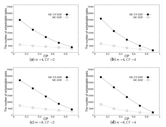 Figure 7 presents the number of task sets deemed schedulable over different values of with fixed values of m and . As shown in Figure 7, compared to Figure 6, the performance gap between MC-EDF and MC-CF-EDF is much prominent. This is because -RM series considered the FP scheduling that interference from lower-priority tasks (and jobs) are not considered when the schedulability of a task is judged, while -EDF series considered EDF scheduling and interference from all tasks (and jobs) other than are considered. This implies that upper bounded interference from higher-priority tasks under FP is normally (but not always) smaller than EDF when we applied our proposed DA test.