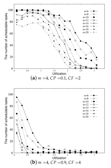 Figure 8 plots the number of task sets deemed schedulable under MC-CF-RM by varying the value of U for fixed values of m, , and . In Figure 8, represents the experimental results from task sets in which each task set contains tasks. Thus, a task in a task set with a smaller number of n and the same U may have higher task utilization . This leads to the phenomenon shown in Figure 8 such that lower n results in higher performance. This is because the underlying idea of DA is to add up the worst-case workload of higher-priority tasks according to Theorem 1 and Lemma 6. The worst-case workload derived in this way is the upper-bounded workload rather than the exact one, and thus the pessimism becomes prominent as n increases. As seen in Figure 8a, and yield the highest and lowest performance, respectively, for , , and . Compared to the combination of , , and (Figure 8a), that of , , and ((Figure 8b) deliver lower performance because the task sets in the setting contain a higher number of HI-criticality tasks.